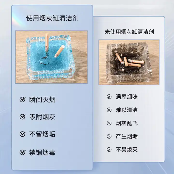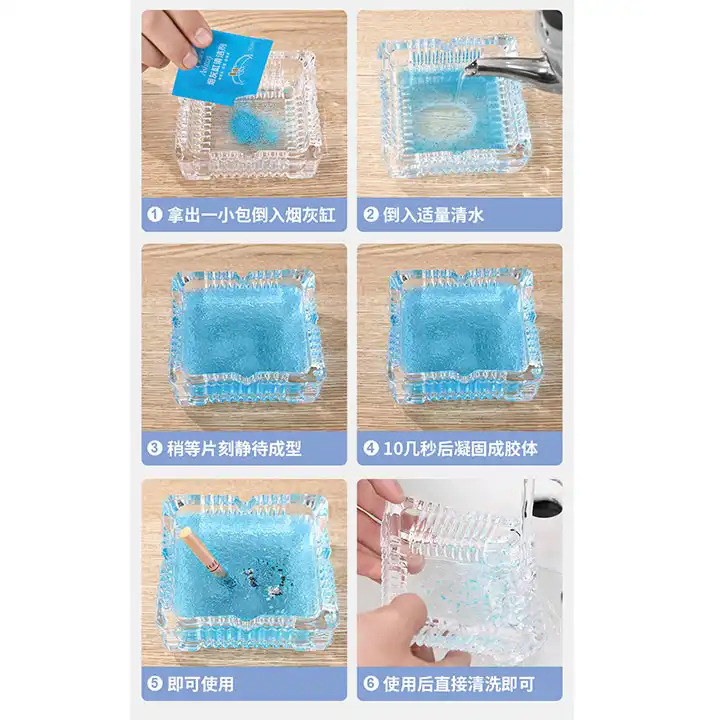 এটি একটি smart ashtray gel powder, যেটা ashtray-তে সামান্য পানি দিলেই কয়েক সেকেন্ডের মধ্যে jelly/gel layer তৈরি করে। Cigarette ash ও butt সাথে সাথে gel-এর মধ্যে ঢুকে lock হয়ে যায় — ফলে ash আর উড়ে না, floor বা টেবিল নোংরা হয় না এবং smoke smell অনেকটাই কমে যায়।